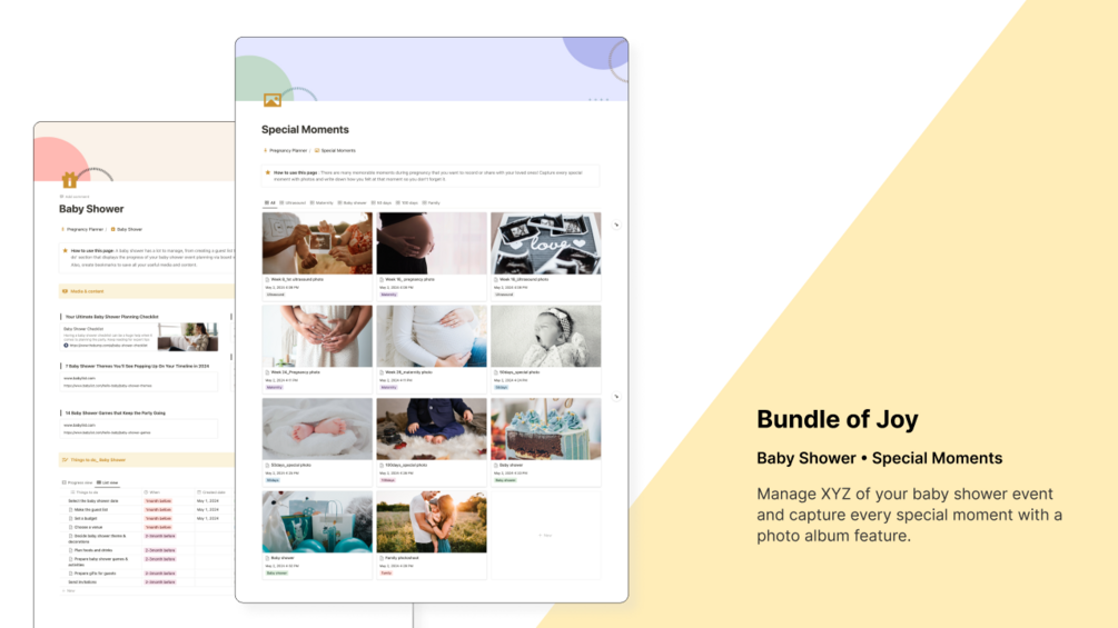 • Baby shower: Manage XYZ of your baby shower event with a useful media content list featuring a to-do board.